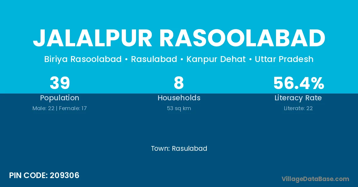 Jalalpur Rasoolabad village has a total population of 39 people, of which 22 are males and 17 are females.