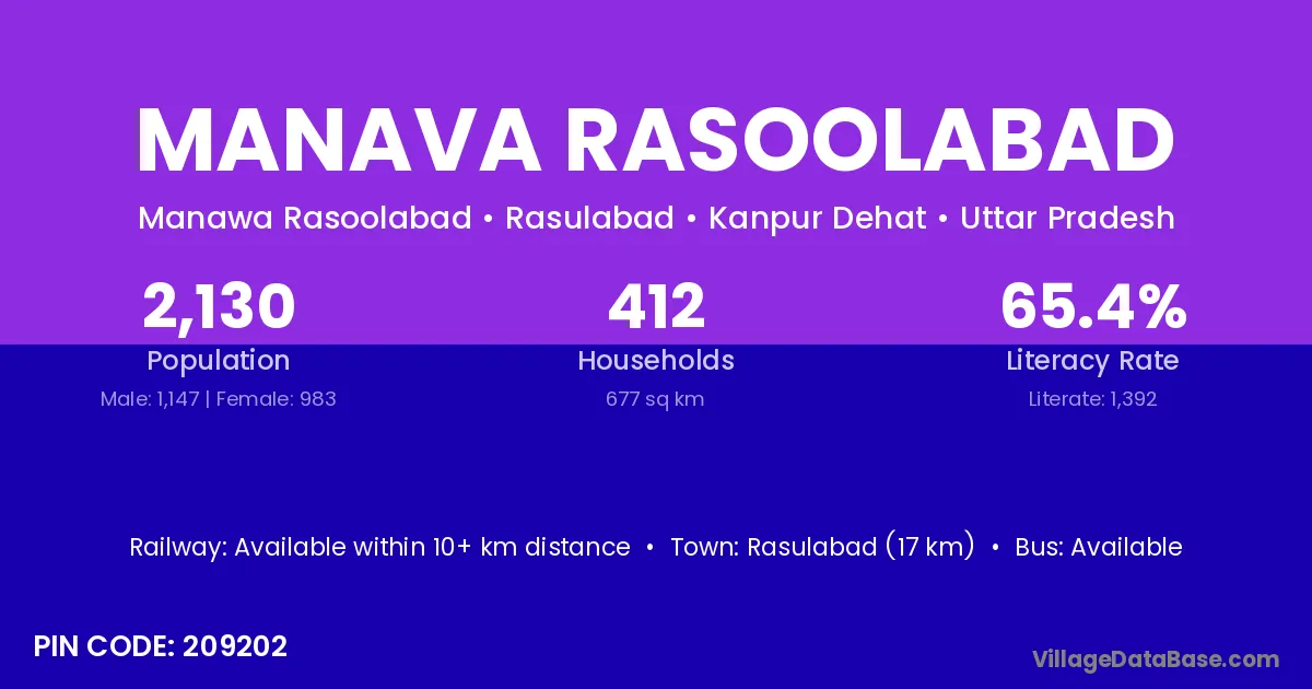 Rasulabad (17 km) is the nearest town to Manava Rasoolabad village for major economic activities and is located approximately 17 km away.