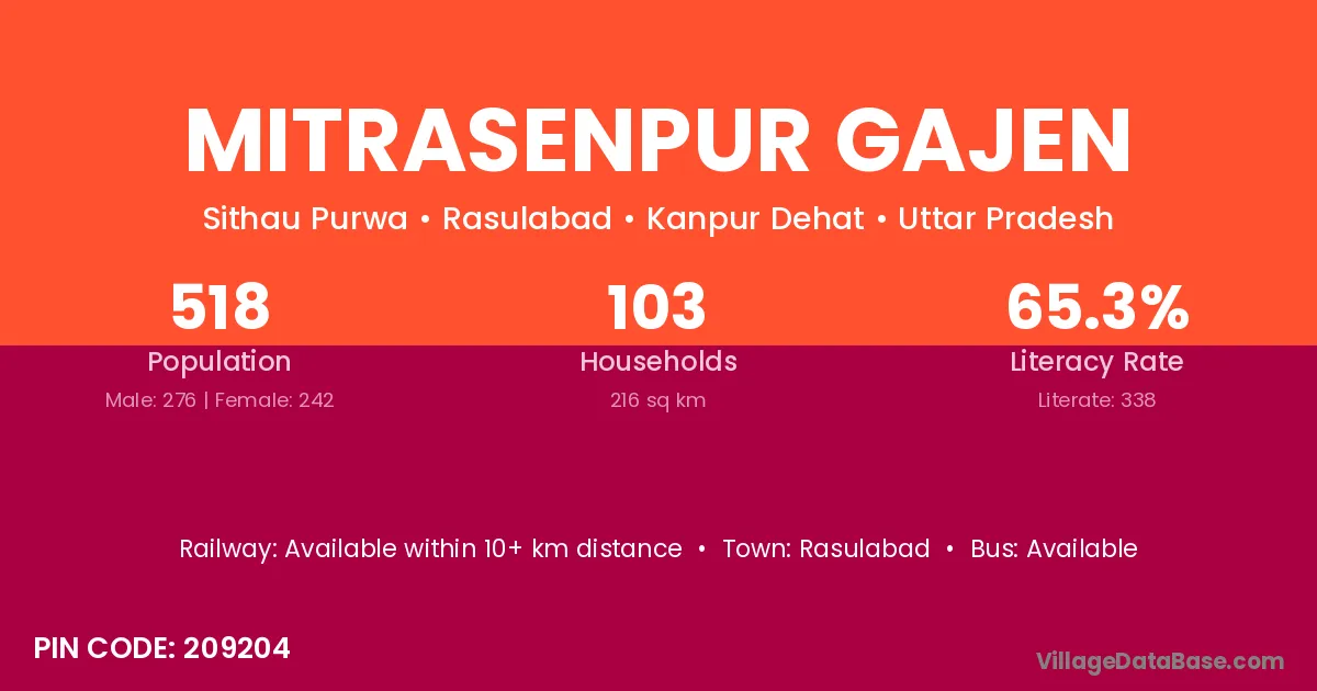 Mitrasenpur Gajen village has a total population of 518 people, of which 276 are males and 242 are females.