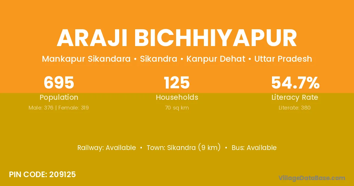 Sikandra (9 km) is the nearest town to Araji Bichhiyapur village for major economic activities and is located approximately 9 km away.
