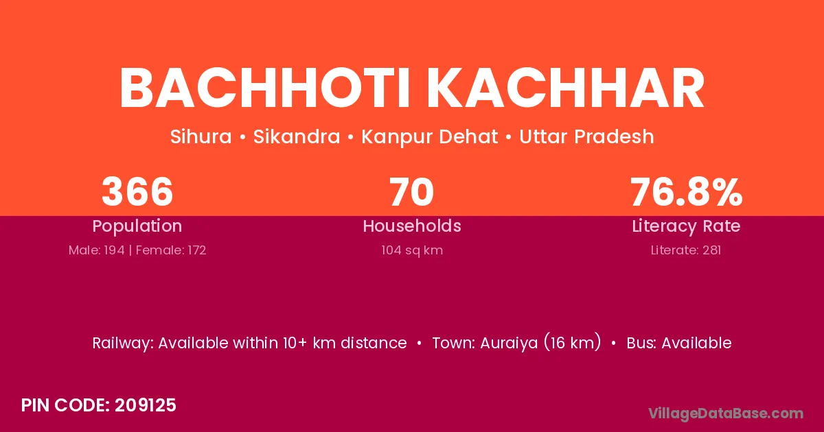 Auraiya (16 km) is the nearest town to Bachhoti Kachhar village for major economic activities and is located approximately 16 km away.