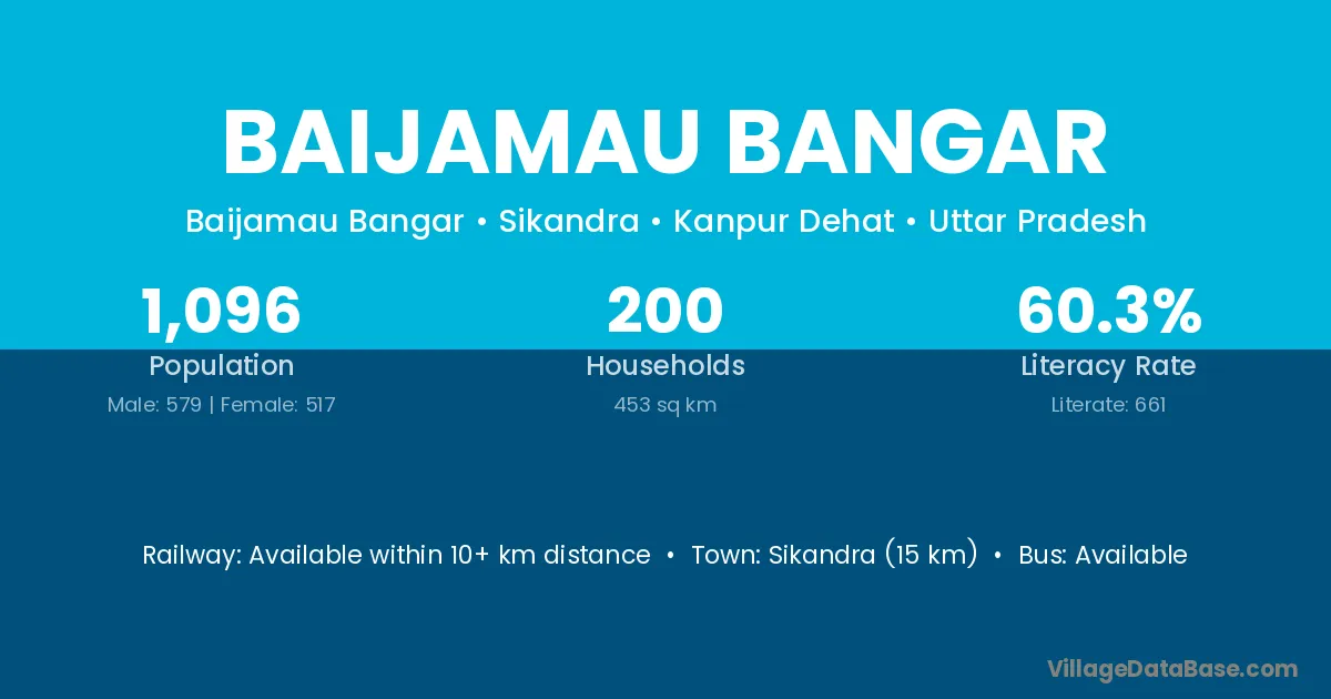 Sikandra (15 km) is the nearest town to Baijamau Bangar village for major economic activities and is located approximately 15 km away.
