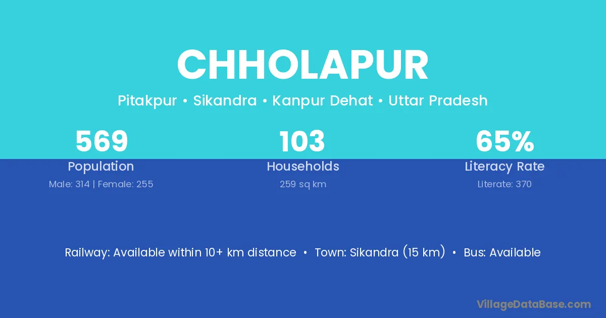 Sikandra (15 km) is the nearest town to Chholapur village for major economic activities and is located approximately 15 km away.