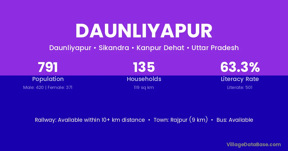 Daunliyapur village has a total population of 791 people, of which 420 are males and 371 are females.