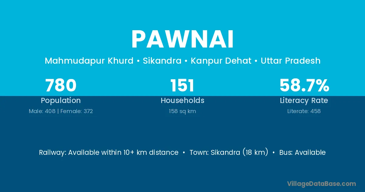 Sikandra (18 km) is the nearest town to Pawnai village for major economic activities and is located approximately 18 km away.