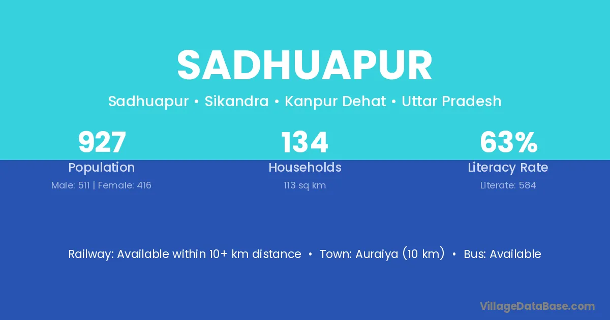 Auraiya (10 km) is the nearest town to Sadhuapur village for major economic activities and is located approximately 10 km away.