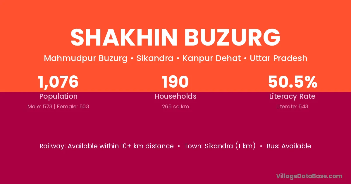 Sikandra (1 km) is the nearest town to Shakhin Buzurg village for major economic activities and is located approximately 1 km away.