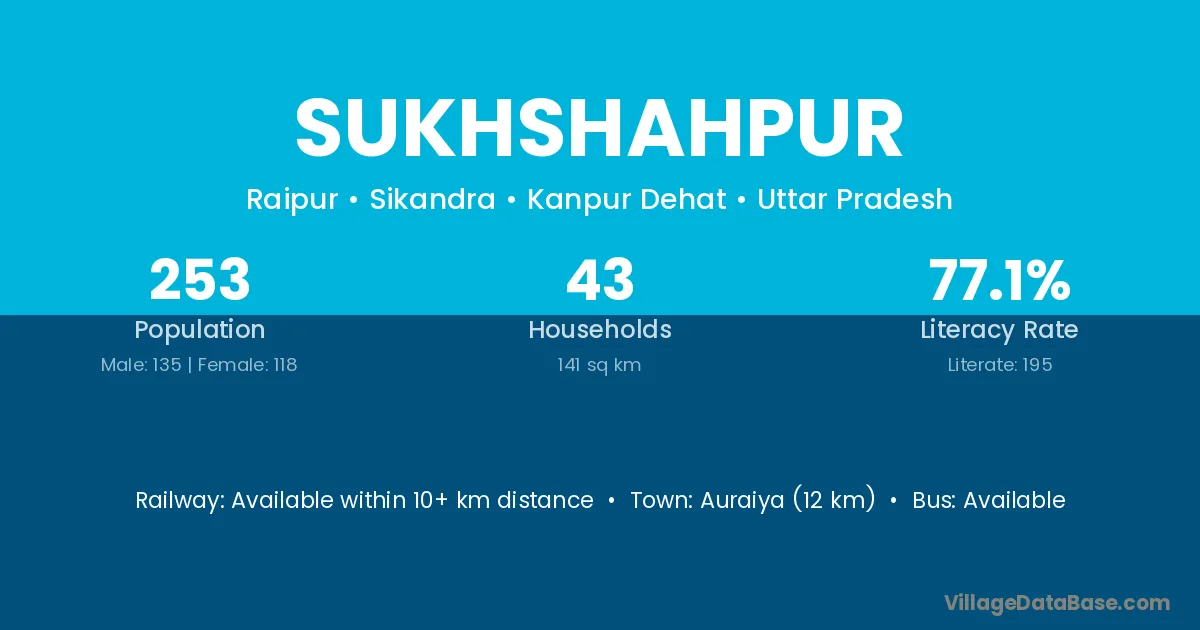 Auraiya (12 km) is the nearest town to Sukhshahpur village for major economic activities and is located approximately 12 km away.