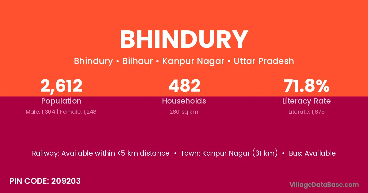 Kanpur Nagar (31 km) is the nearest town to Bhindury village for major economic activities and is located approximately 31 km away.