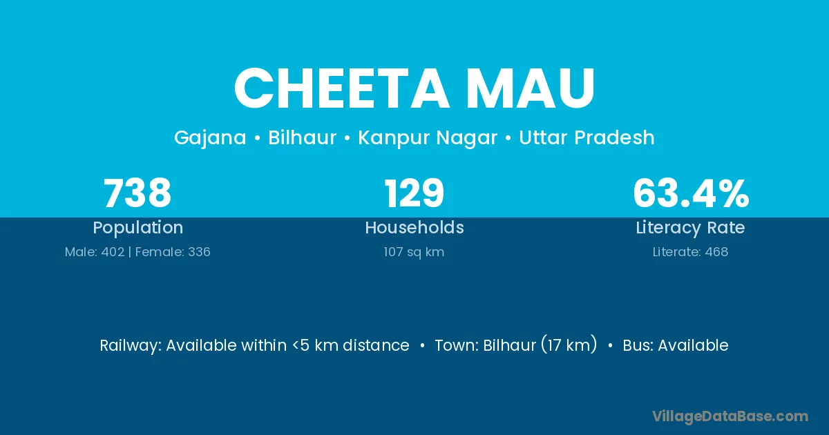 Bilhaur (17 km) is the nearest town to Cheeta Mau village for major economic activities and is located approximately 17 km away.