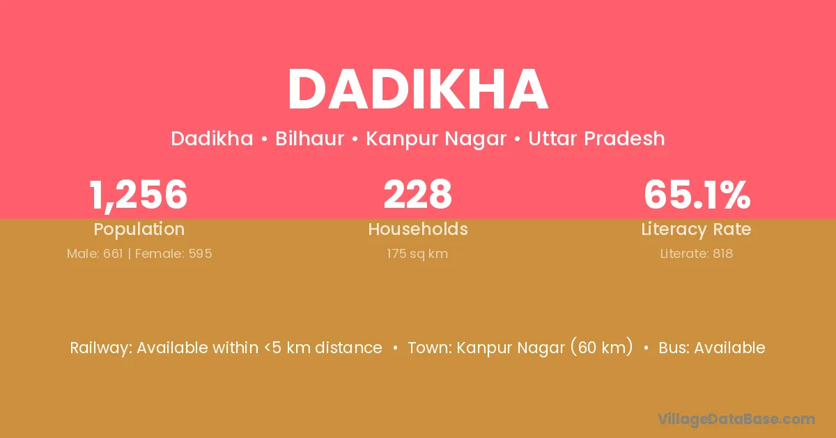 Kanpur Nagar (60 km) is the nearest town to Dadikha village for major economic activities and is located approximately 60 km away.