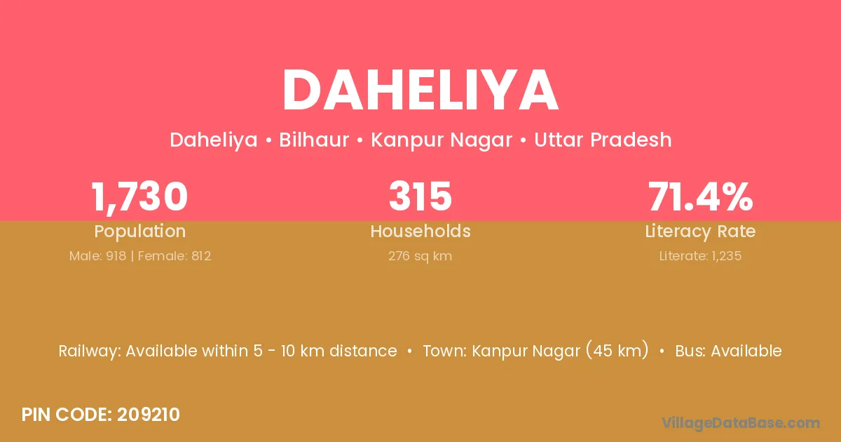 Kanpur Nagar (45 km) is the nearest town to Daheliya village for major economic activities and is located approximately 45 km away.