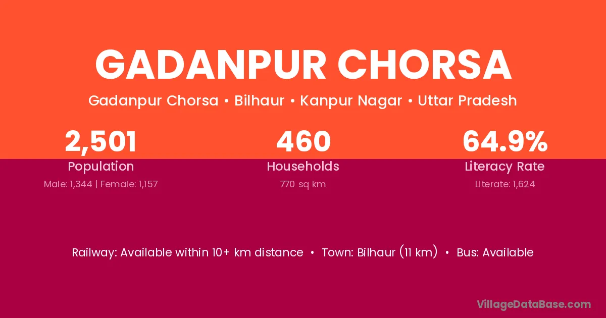 Bilhaur (11 km) is the nearest town to Gadanpur Chorsa village for major economic activities and is located approximately 11 km away.