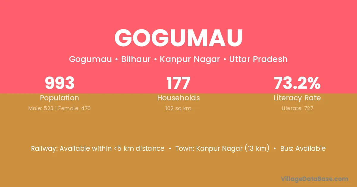 Kanpur Nagar (13 km) is the nearest town to Gogumau village for major economic activities and is located approximately 13 km away.