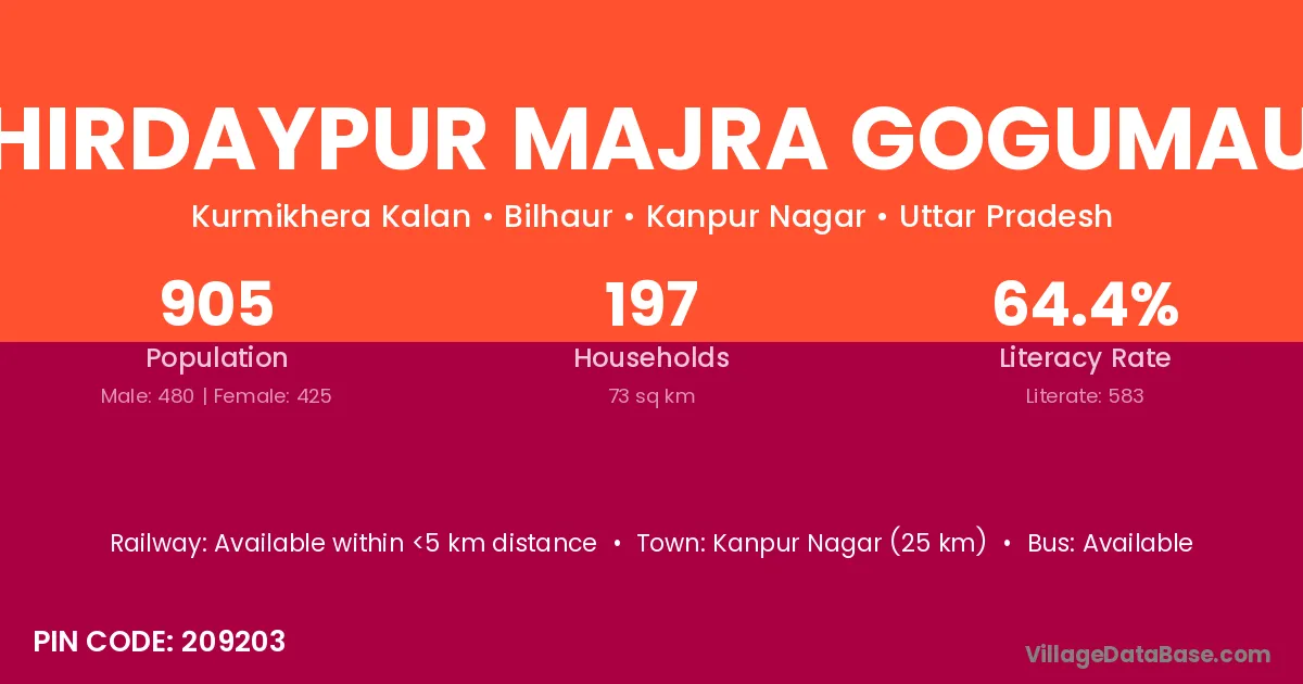 Kanpur Nagar (25 km) is the nearest town to Hirdaypur Majra Gogumau village for major economic activities and is located approximately 25 km away.