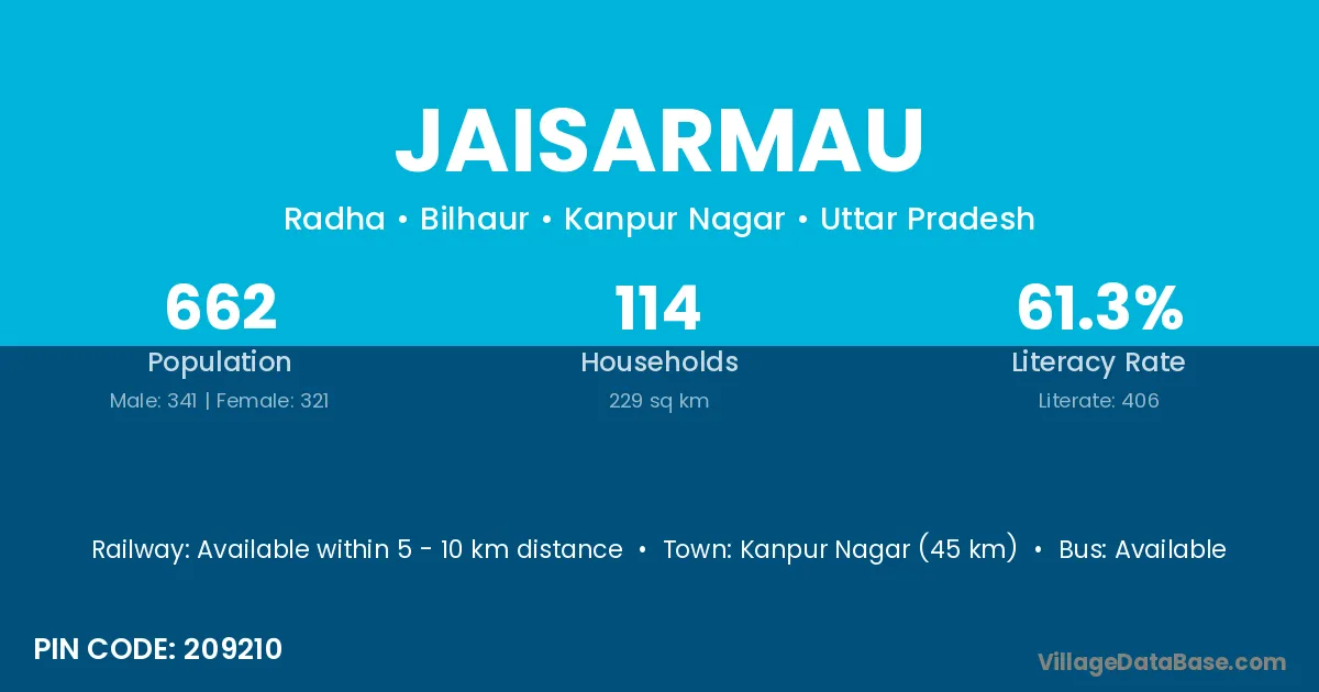 Kanpur Nagar (45 km) is the nearest town to Jaisarmau village for major economic activities and is located approximately 45 km away.