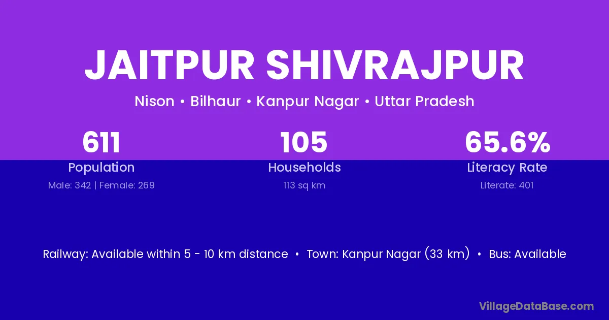Kanpur Nagar (33 km) is the nearest town to Jaitpur Shivrajpur village for major economic activities and is located approximately 33 km away.