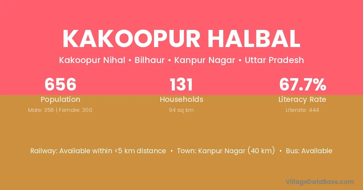 Kanpur Nagar (40 km) is the nearest town to Kakoopur Halbal village for major economic activities and is located approximately 40 km away.