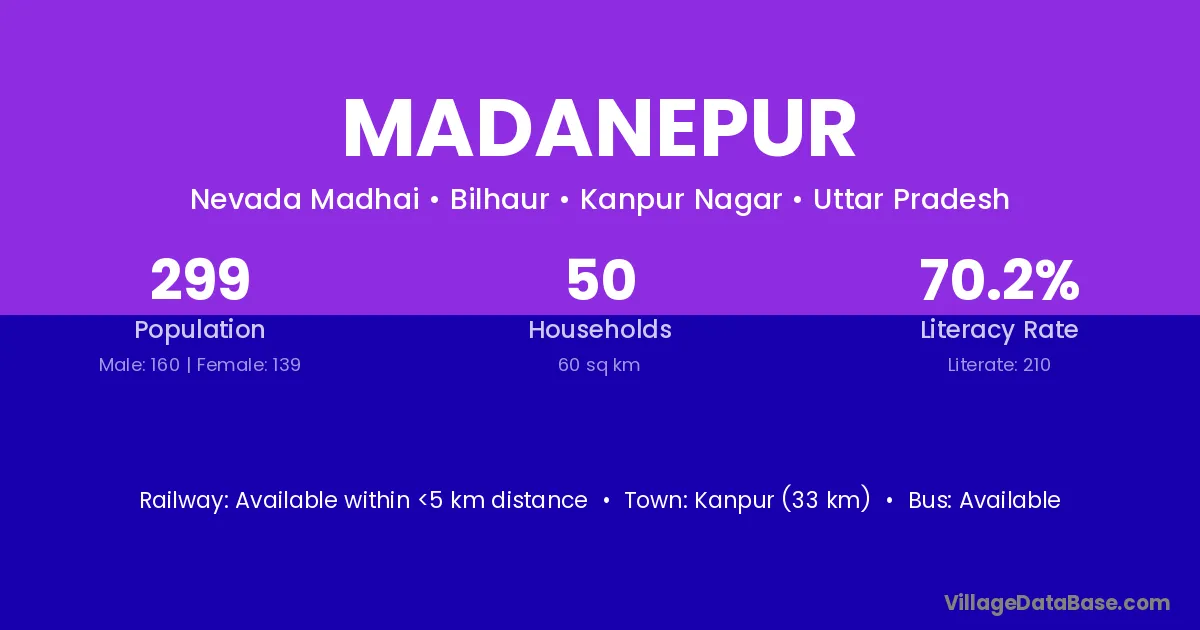 Kanpur (33 km) is the nearest town to Madanepur village for major economic activities and is located approximately 33 km away.