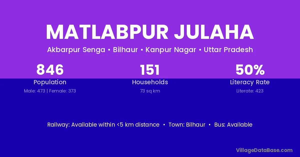 Matlabpur Julaha village has a total population of 846 people, of which 473 are males and 373 are females.