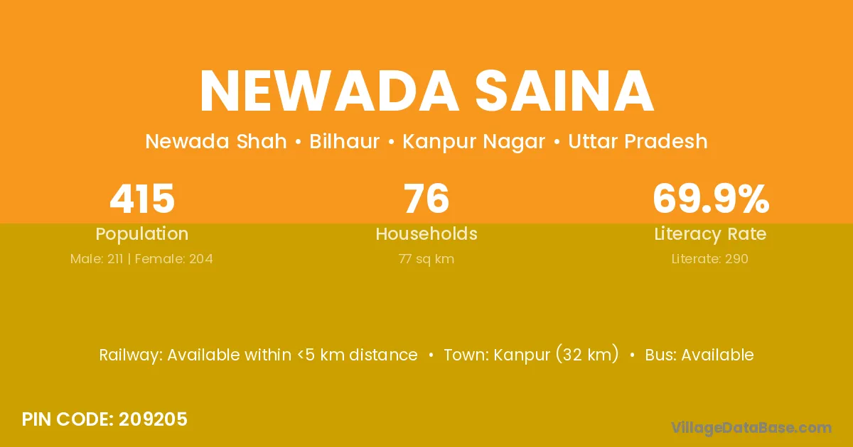 Kanpur (32 km) is the nearest town to Newada Saina village for major economic activities and is located approximately 32 km away.