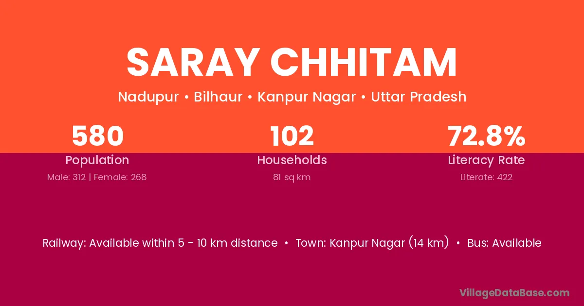 Kanpur Nagar (14 km) is the nearest town to Saray Chhitam village for major economic activities and is located approximately 14 km away.