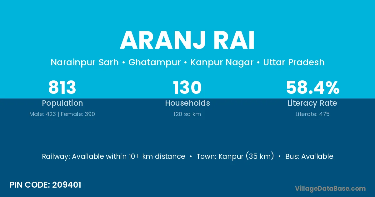 Kanpur (35 km) is the nearest town to Aranj Rai village for major economic activities and is located approximately 35 km away.
