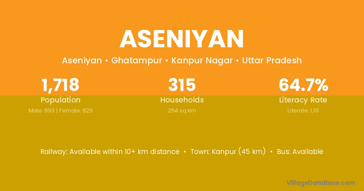 Kanpur (45 km) is the nearest town to Aseniyan village for major economic activities and is located approximately 45 km away.
