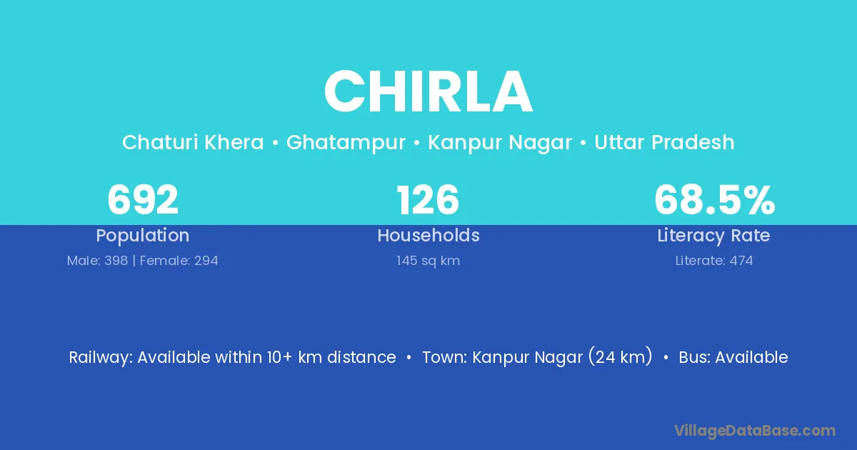 Kanpur Nagar (24 km) is the nearest town to Chirla village for major economic activities and is located approximately 24 km away.