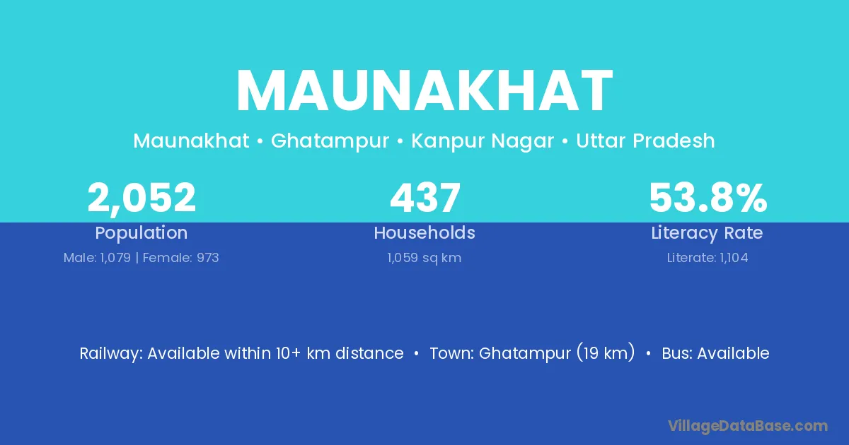 Ghatampur (19 km) is the nearest town to Maunakhat village for major economic activities and is located approximately 19 km away.