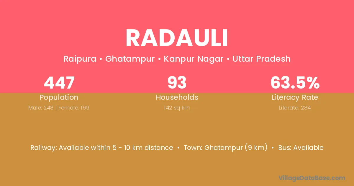 Ghatampur (9 km) is the nearest town to Radauli village for major economic activities and is located approximately 9 km away.