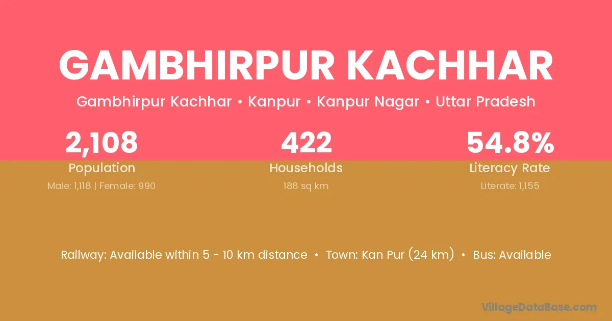 Gambhirpur Kachhar village has a total population of 2,108 people, of which 1,118 are males and 990 are females.