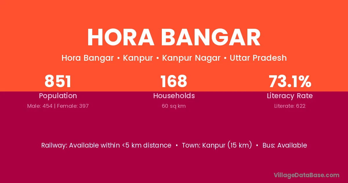 Kanpur (15 km) is the nearest town to Hora Bangar village for major economic activities and is located approximately 15 km away.