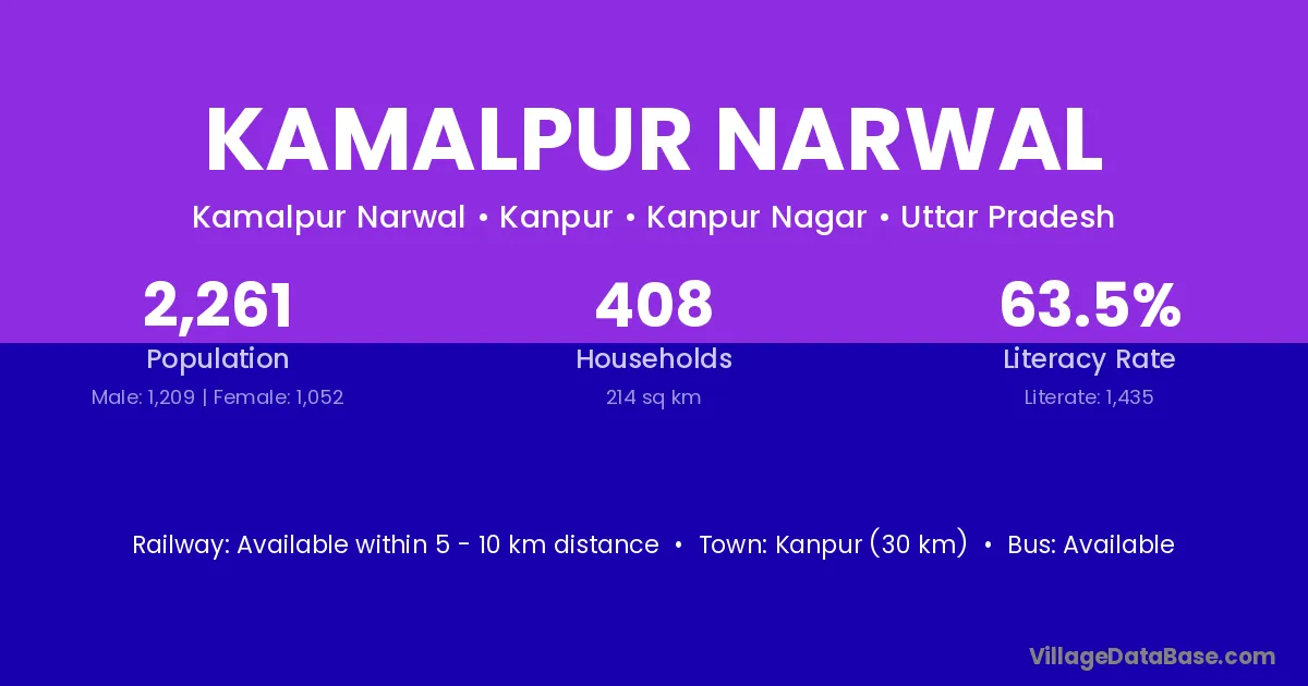 Kanpur (30 km) is the nearest town to Kamalpur Narwal village for major economic activities and is located approximately 30 km away.