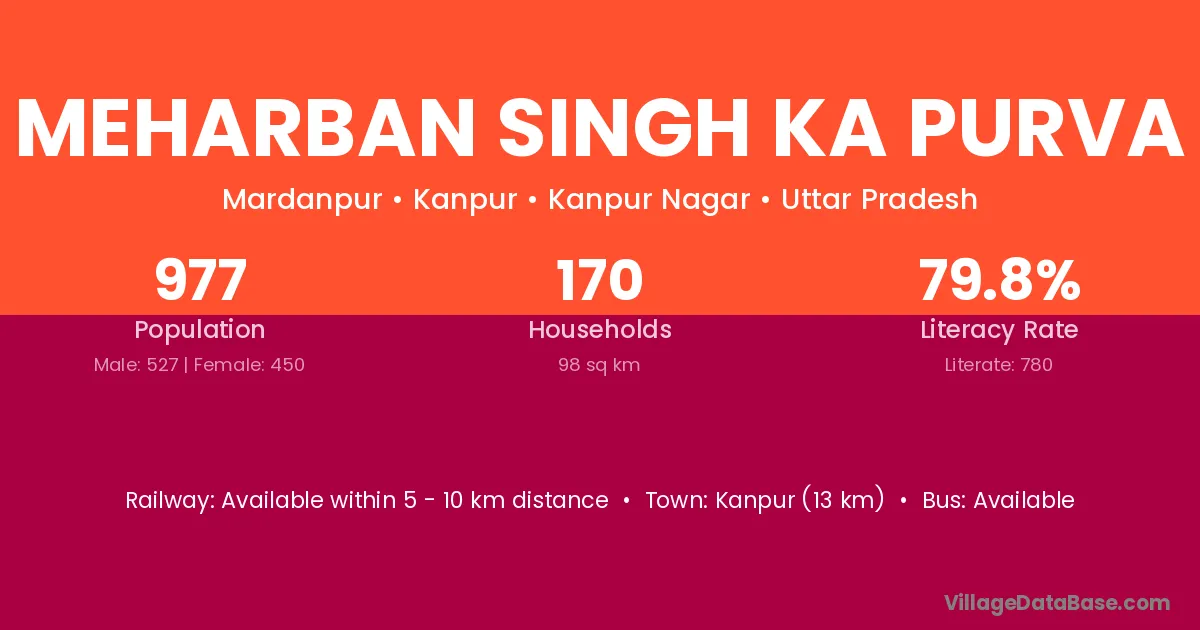 Kanpur (13 km) is the nearest town to Meharban Singh Ka Purva village for major economic activities and is located approximately 13 km away.