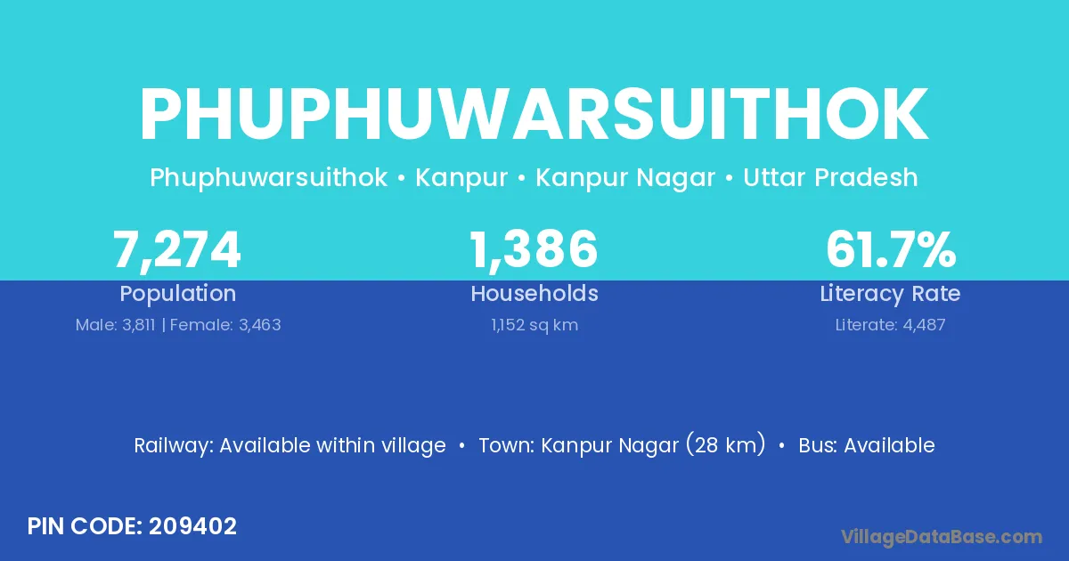 Kanpur Nagar (28 km) is the nearest town to Phuphuwarsuithok village for major economic activities and is located approximately 28 km away.