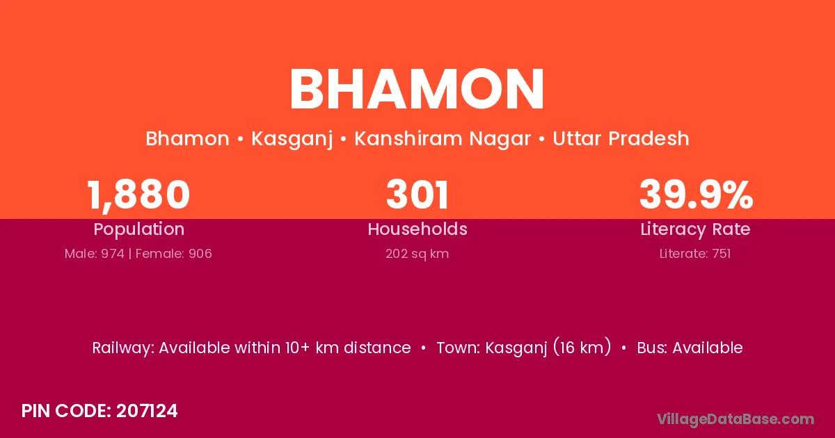 Kasganj (16 km) is the nearest town to Bhamon village for major economic activities and is located approximately 16 km away.