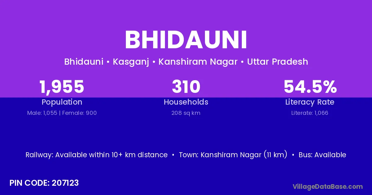 Kanshiram Nagar (11 km) is the nearest town to Bhidauni village for major economic activities and is located approximately 11 km away.