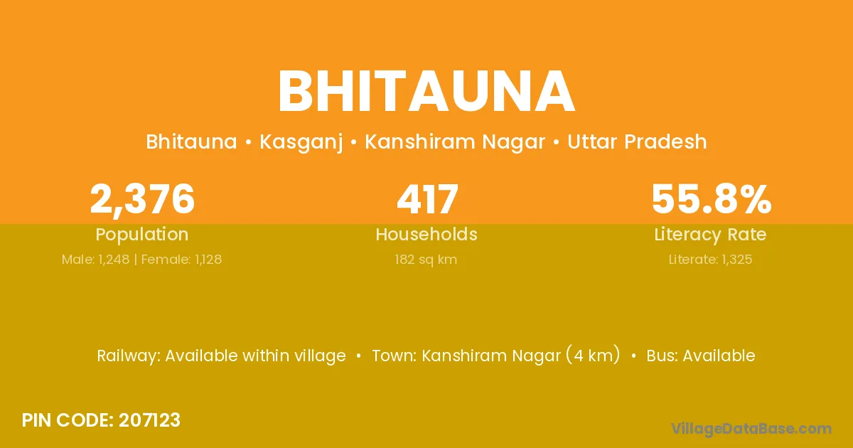 Kanshiram Nagar (4 km) is the nearest town to Bhitauna village for major economic activities and is located approximately 4 km away.