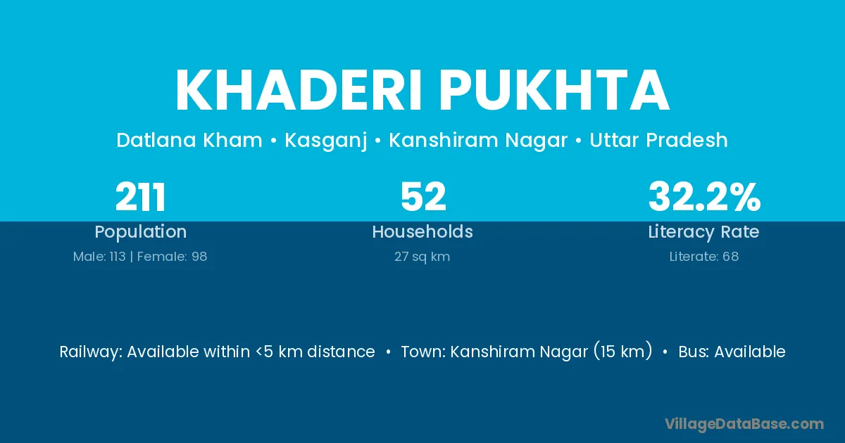 Kanshiram Nagar (15 km) is the nearest town to Khaderi Pukhta village for major economic activities and is located approximately 15 km away.