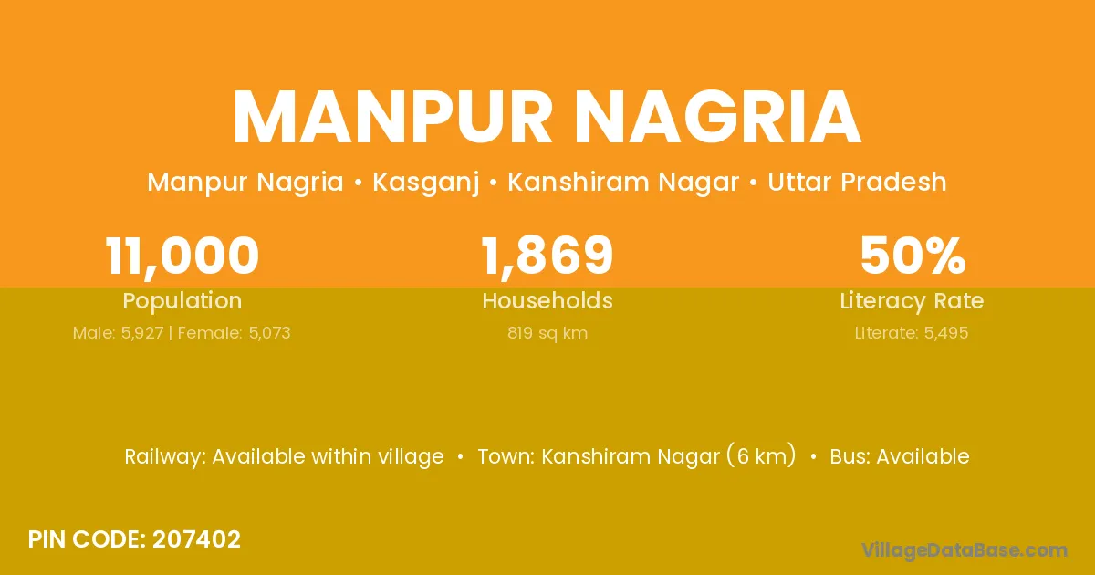 Kanshiram Nagar (6 km) is the nearest town to Manpur Nagria village for major economic activities and is located approximately 6 km away.