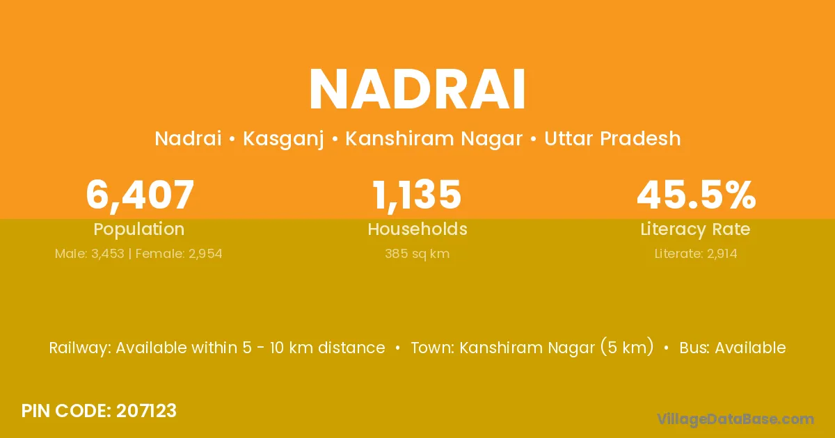Kanshiram Nagar (5 km) is the nearest town to Nadrai village for major economic activities and is located approximately 5 km away.