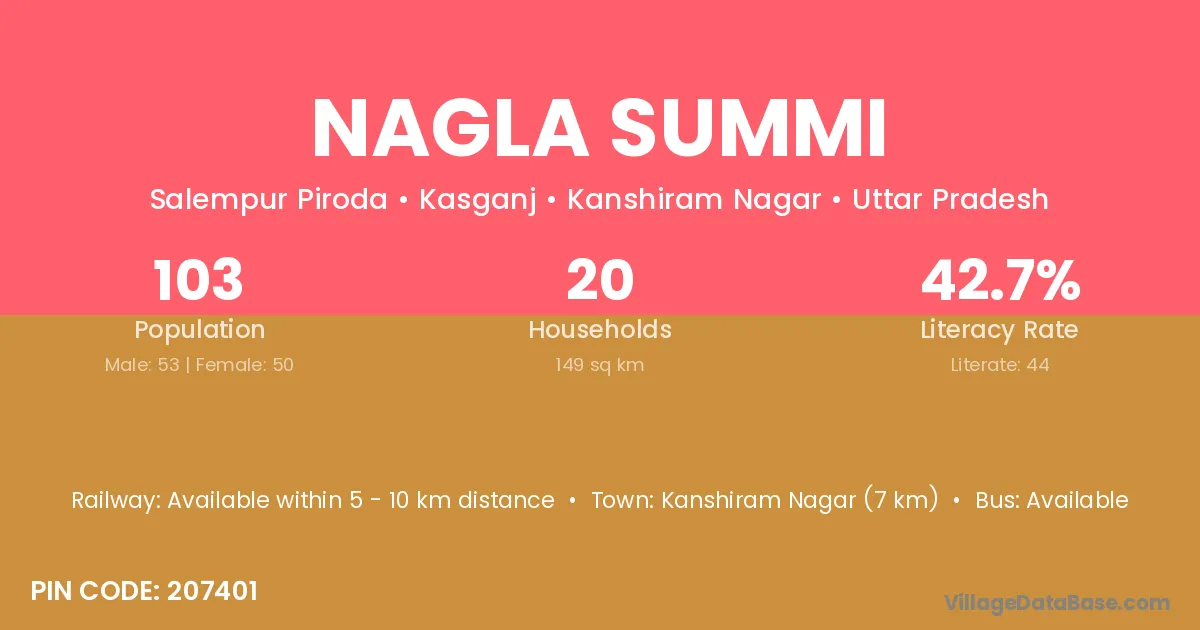 Kanshiram Nagar (7 km) is the nearest town to Nagla Summi village for major economic activities and is located approximately 7 km away.