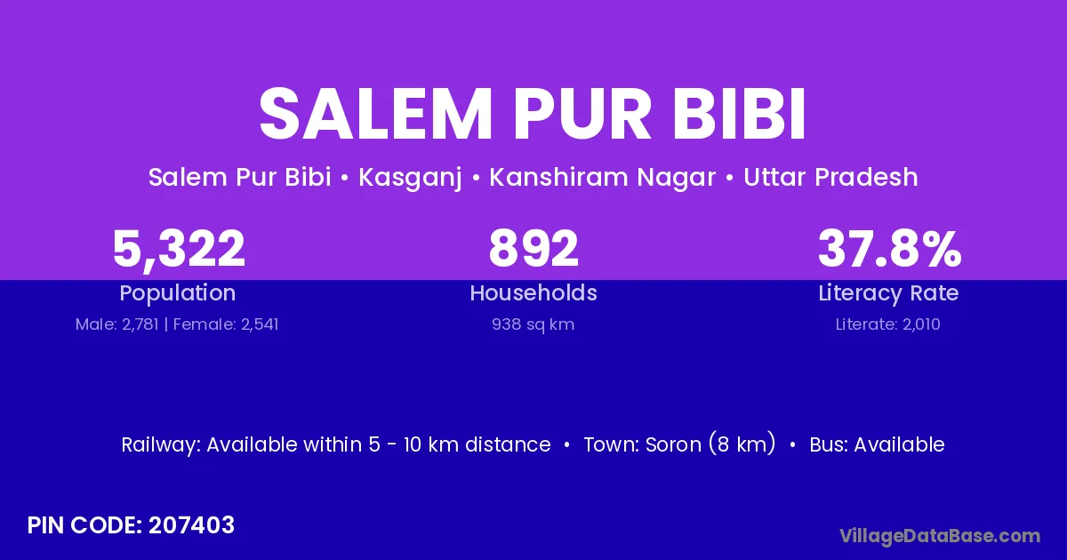 Soron (8 km) is the nearest town to Salem Pur Bibi village for major economic activities and is located approximately 8 km away.