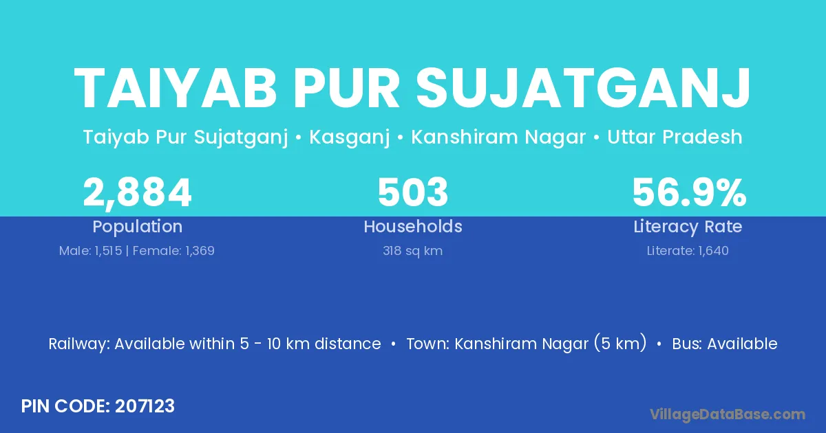 Kanshiram Nagar (5 km) is the nearest town to Taiyab Pur Sujatganj village for major economic activities and is located approximately 5 km away.