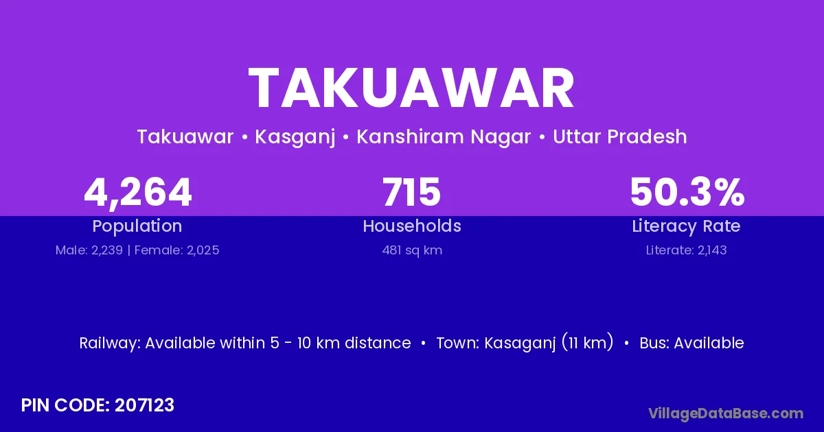 Kasaganj (11 km) is the nearest town to Takuawar village for major economic activities and is located approximately 11 km away.