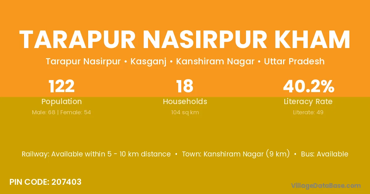 Kanshiram Nagar (9 km) is the nearest town to Tarapur Nasirpur Kham village for major economic activities and is located approximately 9 km away.