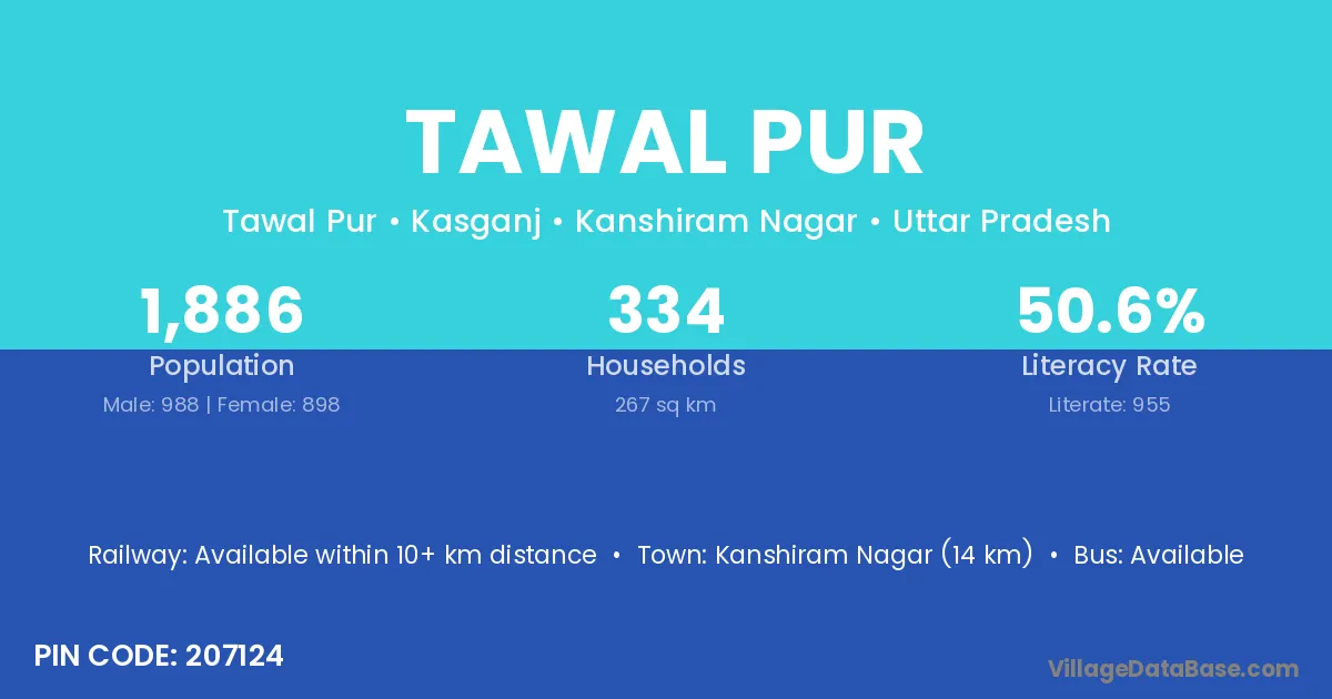Kanshiram Nagar (14 km) is the nearest town to Tawal Pur village for major economic activities and is located approximately 14 km away.