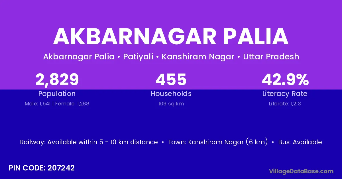 Kanshiram Nagar (6 km) is the nearest town to Akbarnagar Palia village for major economic activities and is located approximately 6 km away.