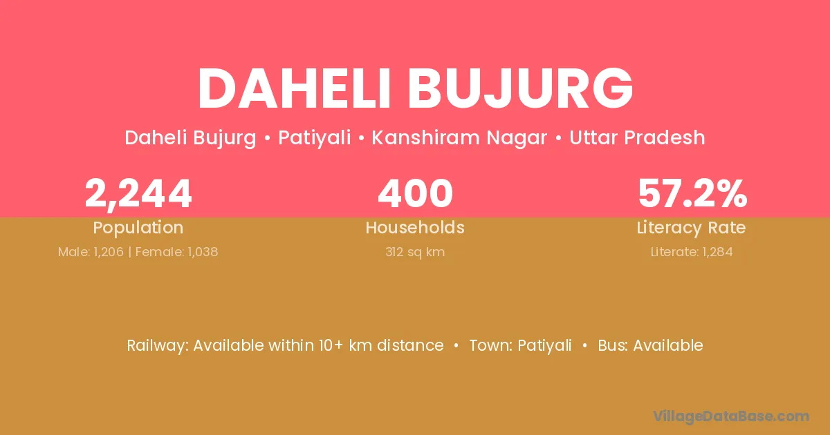 Daheli Bujurg village has a total population of 2,244 people, of which 1,206 are males and 1,038 are females.